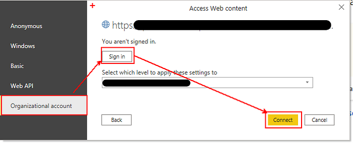 4. Power BI will prompt you to enter credentials and choose Organizational account. Sign in with the credentials for the user account that has access to the data and click “Connect.”
